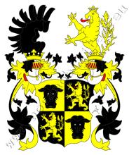 Zlato-černě čtvrcený štít. V prvním a čtvrtém poli černá telecí hlava se stříbrnými zuby, ve druhém a třetím korunovaný dvojocasý lev s červeným jazykem. Na štítě stojí dvě korunované turnajské přílby s černo – zlatými přikrývadly. Klenotem na pravé jsou dvě složená černá křídla, na levé rostoucí zlatý dvojocasý korunovaný lev s červeným jazykem.