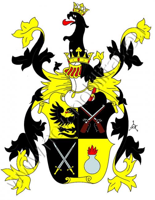 Zlato-černě čtvrcený štít. V prvním poli vyrůstá z dělící linie černý orel, ve druhém dvě křížem přeložené ručnice hlavní nahoru, ve třetím dva vzhůru obrácené meče a ve čtvrtém hořící granát. Na štítě stojí korunovaná turnajská přílba s černo-zlatými přikrývadly. Klenotem je hlava černé korunované orlice s krkem.