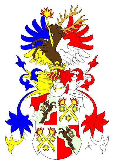Čtvrcený štít. 1. v červeném je šikmá řeka přirozených barev, v ní plave přirozený jelen s parožím o dvanácti výsadách a s červeným jazykem. 2. a 3. ve stříbře dvě zkřížené pochodně, mezi nimi tři zlaté "zdvojené" hvězdy. 4. v červeném je kosmá řeka přirozených barev, v ní plave přirozený jelen s parožím o dvanácti výsadách a s červeným jazykem. Na štítě spočívá korunovaná turnajská přílba s modro - zlatými a červeno - stříbrnými přikrývadly. Klenotem jsou dvě rozevřená křídla, pravé děleno modro -zlatě, levé červeno - stříbrně, mezi nimi je rostoucí jelen ze štítu držící v tlamě zlatou hořící pochodeň.