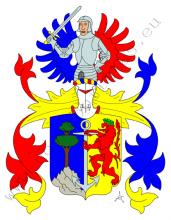Polcený štít. Vpravo roste na skále zelená borovice. Vlevo je ve zlatě červený lev s vavřínovým věncem na hlavě držící před sebou kotvu, jež leží na poltící linii. Na štítě spočívá stříbrná kolčí přílba s červeno – zlatými a modro – zlatými přikrývadly a s točenicí týchž tinktur. Klenotem jsou dvě rozevřená křídla, pravé modré, levé červené, mezi nimi rostoucí obrněný muž s mečem.