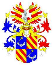 Čtvrcený štít. 1. a 4. v modrém obrněná paže přirozené barvy držící zlatý buzykan. 2. a 3. v červeném tři zlatá kosmá břevna. Na štítě spočívá korunovaná turnajská přílba s modro - zlatými a červeno - zlatými přikrývadly. Klenotem jsou dvě rozevřená křídla se třemi zlatými břevny, pravé kosmými, levé šikmými, mezi křídly paže ze štítu.