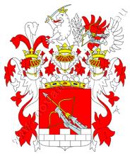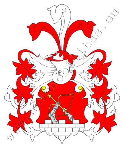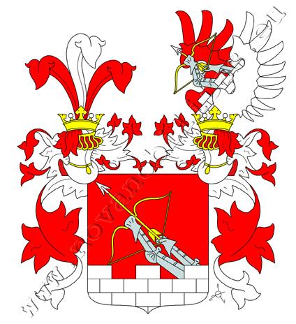 V patě červeného štítu je stříbrná kvádrovaná zeď o třech stínkách, zpoza níž vynikají dvě obrněné paže, ruka vpravo po rameno, ruka vlevo po zápěstí, držící kosmo nahoru obrácený zlatý luk se zlatou střelou se stříbrným opeřením. Na štítě stojí kolčí přílba s červeno-stříbrnými přikrývadly. Klenotem jsou tři pera – stříbrné mezi červenými.