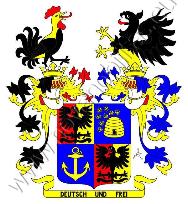 Čtvrcený štít. V prvním a čtvrtém červeno–zlatě polceném poli černá orlice s červeným jazykem. Ostatní dvě pole jsou modrá. Ve druhém je zlatý úl, k němuž se slétají zlaté včely, ve třetím zlatá kotva. Na štítě spočívají dvě korunované turnajské přílby. Klenotem na pravé je přirozený, zlatě a černě zbarvený kohout, přikrývadla černo–zlatá, červeno–zlatá, na levé pak černo–zlatě dělený gryf s červeným jazykem, přikrývadly modro–zlatá. Pod štítem se vine zlatá páska s černou devizou DEUTSCH UND FREI.