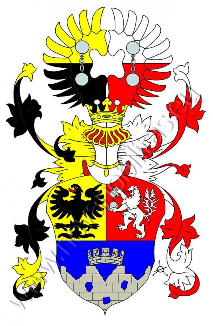 Děleno, nahoře polceno. Pravé horní pole je zlaté s černou orlicí. Ve druhém červeném poli se vidí stříbrný dvojocasý lev držící v předních tlapách dvě železné koule spojené řetězem. Spodní pole je modré s pobořenou hradební zdí na které spočívá hradební koruna. Na štítě stojí korunovaná turnajská přílba s černo-zlatými a červeno-stříbrnými přikrývadly. Klenotem jsou dvě dělená orlí křídla - pravé zlato-černě, levé stříbrno-červeně. Na obou křídlech po dvou železných koulích, vždy po jedné v horní a dolní části, spojených řetězem.