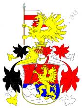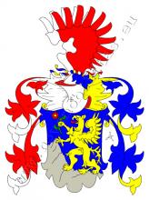 V červeno – modře děleném štítě se stříbrno – zlatě děleným okrajem je v patě stříbrná skála vybíhající vpravo až k dělící linii, na skále stojí zlatý korunovaný gryf s červeným jazykem držící v pravém pařátu partyzánu těsně pod třapcem, jejíž žerdí se opírá o vršek skály, levým pařátem se dotýká téže skály. Na štítě spočívá korunovaná turnajská přílba s černo - zlatými a červeno – stříbrnými přikrývadly. Klenotem je rostoucí zlatý korunovaný gryf s červeným jazykem držící v obou pařátech stříbrno – červený praporec.