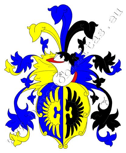 Modro – zlatě polcený štít. Vpravo je zlaté křídlo, vlevo černé křídlo. Na štítě spočívá kolčí přílba s modro – zlatými a černo – modrými přikrývadly. Klenotem jsou tři pera, zlaté, modré a černé.