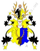 Ve zlato – modře polceném štítě je přirozená jelení hlava s parohy, každým o pěti výsadách. Na štítě spočívá korunovaná kolčí přílba s černo – zlatými přikrývadly. Klenotem jsou dva parohy jelena ze štítu, mezi nimi rostoucí bradatý holohlavý muž v černo – zlatě polceném šatě se zlatými a černými knoflíky a zapínáním.