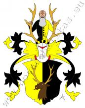 Ve zlato – černě polceném štítě je přirozená jelení hlava hledící do prava s parohy, každým o čtyřech výsadách. Na štítě spočívá kolčí přílba s černo – zlatými přikrývadly a s točenicí týchž tinktur. Klenotem jsou dva parohy jelena ze štítu, mezi nimi rostoucí bradatý holohlavý muž v černo – zlatě polceném šatě s černými knoflíky.