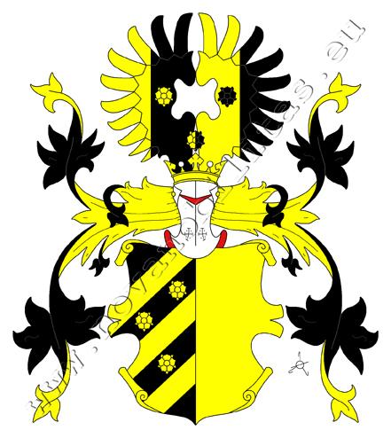 Černo-zlatě polcený štít. Vpravo jsou tři zlatá šikmá břevna, prostřední provázené nahoře dvěma, dole jednou zlatou růží. Na štítě spočívá korunovaná kolčí přílba s černo–zlatými přikrývadly. Klenotem jsou dvě rozevřená, zlato–černě polcená křídla, pravé má v levé polovině zlatou růži, levá má v pravé polovině černou růži, dole mezi křídly je zlato–černě polcená růže.