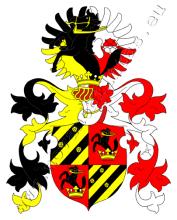Čtvrcený štít. 1. a 4. v černém tři zlatá šikmá břevna, prostřední je nahoře provázeno dvěma, dole jednou zlatou růží. 2. a 3. v červeném zlatá koruna, z níž vyrůstá černý kůň se zlatou uzdou. Na štítě spočívá korunovaná turnajská přílba s černo–zlatými a červeno–stříbrnými přikrývadly. Klenotem jsou dvě rozevřená křídla, pravé dělené černo – zlatě, levé stříbrno-červeně, na každém je uprostřed růže střídavých tinktur.