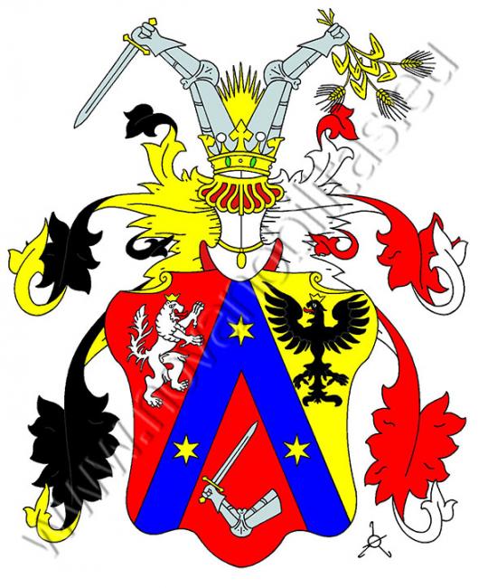 Modrou krokví, na níž se vidí tři zlaté hvězdy, rozdělený štít. Přední pole je červené se stříbrným, korunovaným, doleva obráceným lvem. V zadním zlatém poli je černá korunovaná orlice. Spodní pole je červené s obrněnou rukou držící meč se zlatým jílcem a záštitou. Na štítě stojí korunovaná turnajská přílba s černo-zlatými a červeno-stříbrnými přikrývadly. Klenotem jsou dvě proti sobě postavené obrněné ruce, pravá držící meč se zlatým jílcem a záštitou a levá se třemi žitnými klasy, mezi kterými vynikají sluneční paprsky.