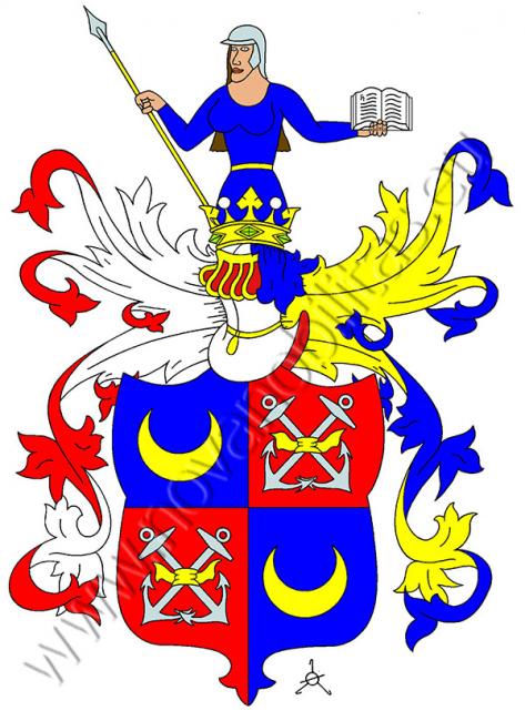 Modro-červeně čtvrcený štít. V prvním a čtvrtém poli stoupající zlatý měsíc. Ve třetím a čtvrtém poli dvě zkřížené, zlatou stuhou svázané kotvy. Na štítě stojí korunovaná turnajská přílba s červeno-stříbrnými a modro-zlatými přikrývadly. Klenotem je rostoucí bohyně Bellona v modrém, zlatě přepásaném pohanském šatě a s přílbou na hlavě, která drží v pravé ruce kopí na zlatém ratišti, v levé otevřenou knihu.