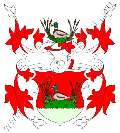 V červeném štítě je voda, z niž vyniká ostrůvek obklopený rákosím, z něhož vystupuje vzhůru sedm rákosových palic, na ostrůvku sedí kačer. Na štítě spočívá kolčí přílba s červeno – stříbrnými přikrývadly. Klenotem je ostrůvek s kačerem ze štítu.