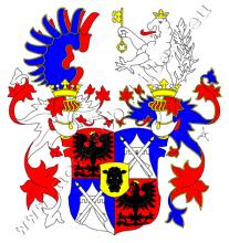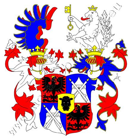 Červeno-modře čtvrcený štít se zlatým srdečním štítkem s černou telecí hlavou. V prvním a čtvrtém poli je do středu hledící černá, zlatě korunovaná orlice s červeným jazykem, ve druhém a třetím v modrém vojenský stan, před nímž jsou dvě zkřížené hořící svíce, obojí stříbrné. Na štítě stojí dvě korunované turnajské přílby. Klenotem na pravé s červeno-stříbrnými přikrývadly jsou dvě zavřená křídla, přední modré se zlatými štrýšky, zadní červené, z levé s přikrývadly nahoře červenými, dole modrými, se zlatými štrýšky, vyrůstá stříbrný korunovaný [dvojocasý] lev s červeným jazykem držící v pravé tlapě zlatý klíč zuby doprava.
