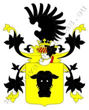 Zlato-černě čtvrcený štít. V prvním a čtvrtém poli černá telecí hlava se stříbrnými zuby, ve druhém a třetím korunovaný dvojocasý lev s červeným jazykem. Na štítě stojí dvě korunované turnajské přílby s černo – zlatými přikrývadly. Klenotem na pravé jsou dvě složená černá křídla, na levé rostoucí zlatý dvojocasý korunovaný lev s červeným jazykem.