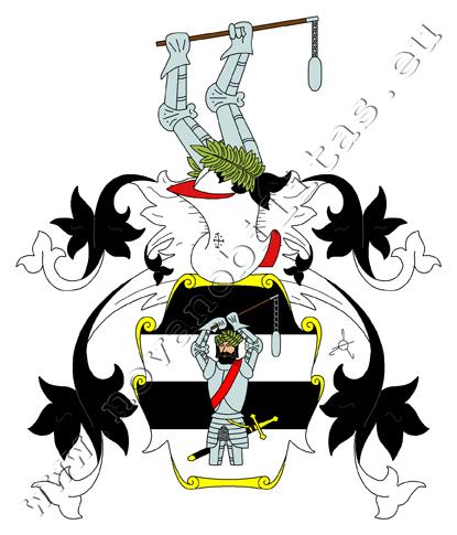 Štít třikrát dělený černě a stříbrně, v něm polovina obrněného muže po kolena, s černým vousem a chmelovým věncem na hlavě opásaného mečem a s červenou šerpou šikmo přes zbroj, držícího oběma rukama železný cep připravený k ráně. Na štítě spočívá kolčí přílba s černo – stříbrnými přikrývadly a s chmelovým věncem. Klenotem jsou dvě obrněné paže držící cep ze štítu.