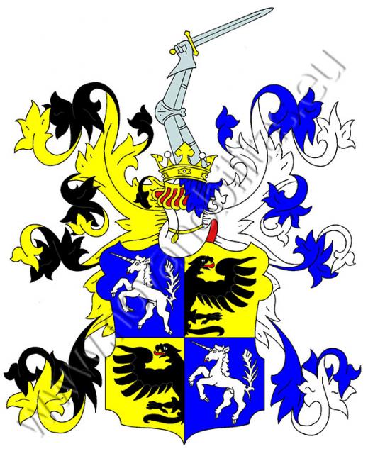 Modro-zlatě čtvrcený štít. V prvním a čtvrtém poli se vidí stříbrný jednorožec, ve druhém a třetím je černý polovičný orel. Na štítě stojí korunovaná turnajská přílba s černo-zlatými a modro-stříbrnými přikrývadly. Klenotem je obrněná ruka držící meč.