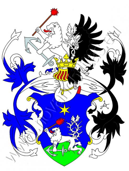 V modrém štítě se na zeleném trojvrší vidí zlatou hvězdou převýšený stříbrný ležící dvojocasý lev, který drží v pravé zdvižené tlapě hořící pochodeň, v levé dopředu obrácenou železnou kotvu. Na štítě stojí korunovaná turnajská přílba s modro-stříbrnými a černo-stříbrnými přikrývadly. V klenotu je lev ze štítu a za ním černé orlí křídlo.