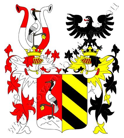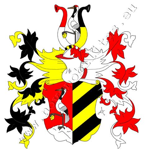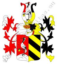 Polcený štít. Vpravo v červeném stojí na stříbrné skále jeřáb přirozených barev držící v pravé noze zlatý kámen. Vlevo pětkrát děleno černě a zlatě. Na štítě spočívá korunovaná turnajská přílba s černo–zlatými a červeno–stříbrnými přikrývadly a s točenicí týchž tinktur. Klenotem jsou dva rohy, pravý dělený červeno–stříbrně, levý černo–zlatě, mezi nimi jeřáb ze štítu.