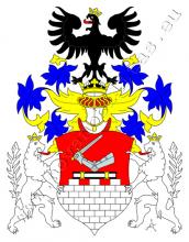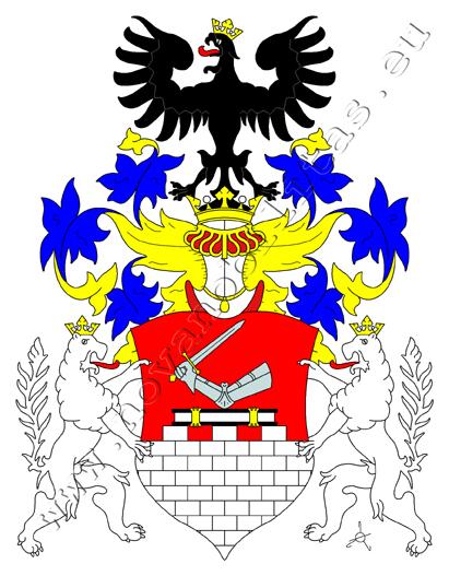 V červeném štítě je stříbrná kvádrová zeď se třemi stínkami, na které spočívá kniha v černé vazbě a na ní obrněná paže držící meč se zlatým jilcem a záštitou. Na štítě spočívá korunovaná turnajská přílba s modro–zlatými přikrývadly. Klenotem je černá, zlatě korunovaná orlice s červeným jazykem. Štítonoši jsou dva zlatě korunovaní stříbrná lvi s červeným jazykem.