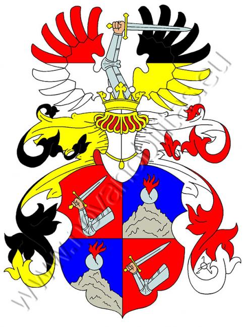 Červeno-modře čtvrcený štít. V prvním a čtvrtém poli se vidí obrněná ruka držící meč s zlatým jilcem a záštitou. V druhém a třetím poli je skála a na ní hořící granát. Na štítě stojí korunovaná turnajská přílba s černo-zlatými a červeno-stříbrnými přikrývadly. V klenotu jsou dvě křídla, pravé děleno červeno-stříbrně, levé černo-zlatě, mezi nimi obrněná ruka s mečem ze štítu.