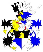 Dělený štít. Nahoře v černém je doprava obrácená zlatá lví hlava s červeným jazykem. Dole modro – stříbrně polceno. Na štítě spočívá korunovaná kolčí přílba s černo – zlatými a modro – stříbrnými přikrývadly. Klenotem jsou dvě složená křídla, přední stříbrno – modře dělené, zadní černé, mezi nimi lví hlava ze štítu.