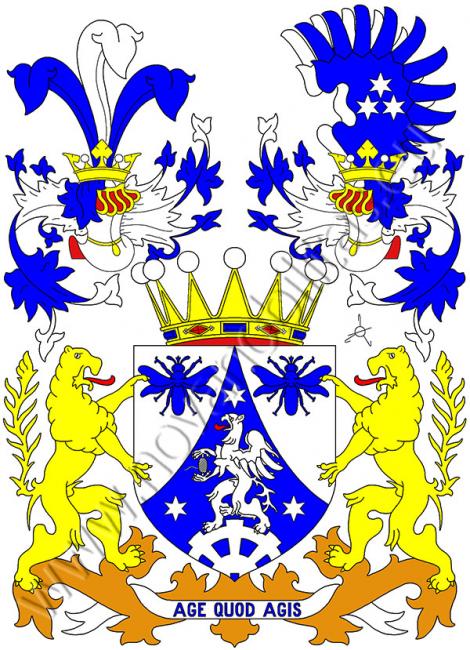 Ve stříbrném štítě modrá špice provázená v každém horním poli modrou včelou. Ve špici stojí na ozubeném kole vycházejícím z paty štítu gryf s červeným jazykem držící v předních spárech vřeteno s navinutou nití, který je provázen třemi hvězdami (1:2) - vše stříbrné. Na štítě spočívá koruna svobodných pánů a na ní jsou dvě korunované turnajské přílby s modro-stříbrnými přikrývaly. Z pravé vynikají tři pera, stříbrné mezi modrými. Na levé jsou dvě zavřená křídla, přední modré se třemi stříbrnými hvězdami (1:2), zadní stříbrné. Štítonoši jsou dva zlatí lvi s červenými jazyky a zbrojí stojící na bronzové arabesce, na které je zavěšena stříbrná páska s modrým heslemAge quod agis.