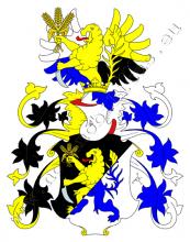V černo – stříbrně šikmo děleném štítě je zlato – modře šikmo dělený lev s červeným jazykem držící v pravé přední tlapě tři pšeničné klasy a v lavé přední tlapě železnou radlici. Na štítě spočívá korunovaná kolčí přílba s černo – zlatými a modro – stříbrnými přikrývadly. Klenotem jsou dvě rozevřená křídla, pravé dělené stříbrno – modře, levé zlato – černě, mezi nimi rostoucí lev ze štítu.