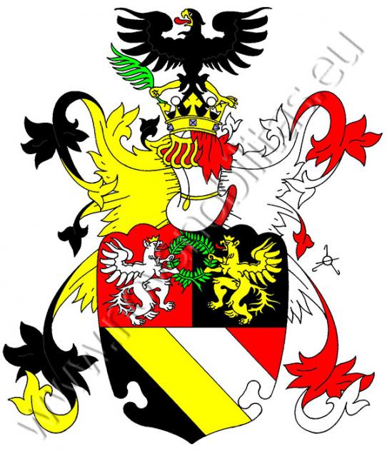 Dělený, nahoře červeno-černě polcený štít. V horní části štítu proti sobě stojí dva korunovaní gryfové, v pravém poli stříbrný, v levém zlatý, kteří společně drží zelený vavřínový věnec. Spodní pole je třikrát kosmo děleno - (zprava) černě, zlatě, stříbrně a červeně. Na štítě stojí korunovaná turnajská přílba s černo-zlatými a červeno-stříbrnými přikrývadly. Klenotetm je černá orlice držící v pravém spáru zelenou palmovou ratolest.