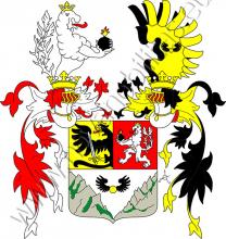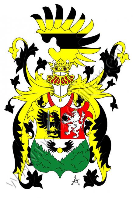 Štít dělený, nahoře polcený. V pravém zlatém poli vyniká od dělící čáry polovičný černý zlatě korunovaný orel, který drží ve spáru meč. V levém červeném poli stříbrný zlatě korunovaný lev držící v tlapách černou kouli. Ve spodním stříbrném poli zlatá okřídlená koule mezi dvěma zelenými skalami. Na korunované přílbě s černo-zlatými přikrývadly černo-zlatě pruhované křídlo.