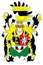 Štít dělený, nahoře polcený. V pravém zlatém poli vyniká od dělící čáry polovičný černý zlatě korunovaný orel, který drží ve spáru meč. V levém červeném poli stříbrný dvouocasý korunovaný lev držící v předních tlapách hořící černý granát. Ve spodním stříbrném poli zlatá černě okřídlená koule mezi dvěma z okrajů štítu vyrůstajícími skalami přirozené barvy. Na štítě stojí dvě korunované turnajské přílby. Z pravé s červeno-stříbrnými přikrývadly vyrůstá stříbrný dvouocasý korunovaný držící v předních tlapách hořící černý granát. Klenotem na levé přílbě s černo-zlatými přikrývadly jsou zavřená křídla – přední zlaté se zlatou černě okřídlenou koulí, zadní černé.