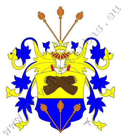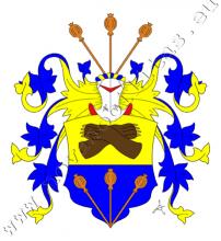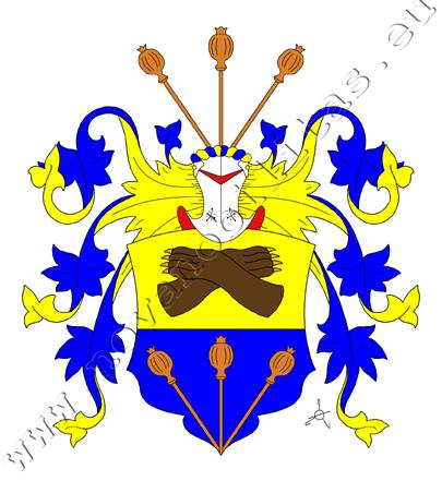 Zlato-modře dělený štít. Nahoře dvě zkřížené hnědé medvědí tlapy se zlatými drápy, dole vyrůstají z hrotu štítu tři odvrácené makovice přirozené barvy. Na štítě stojí kolčí přílba s modro-zlatými přikrývadly a točenicí. Klenotem jsou tři odvrácené makovice přirozené barvy.