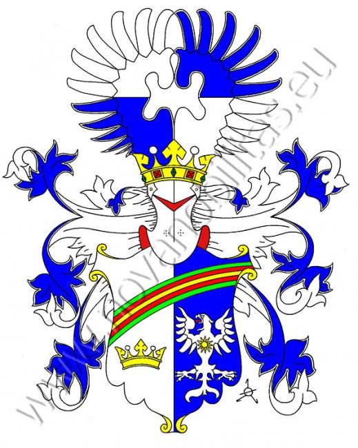 Stříbrno-modře polcený štít. Vpravo zlatá koruna, vlevo stříbrná orlice se zlatým sluncem na prsou. V hlavě štítu, nad oběma figurami, se vidí zeleno-červeno-zlato-červeno-zelená duha. Na štítě stojí korunovaná kolčí přílba s přikrývadly modrými se stříbrnými okraji a stříbrnými. Klenotem jsou dvě křídla - pravé nahoře stříbrné, dole modré se stříbrným okrajem a levé nahoře modré se stříbrným okrajem a dole stříbrné.