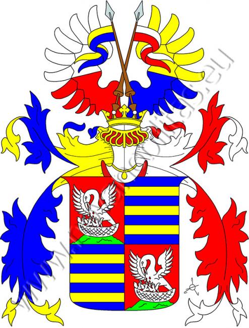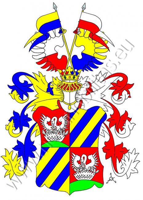 Čtvrcený štít. V prvním a čtvrtém červeném poli sedí na zelené skále stříbrný pelikán v hnízdě krmící své mladé vlastní krví. Ve druhém a třetím modrém poli jsou tři zlatá břevna. Na štítě stojí korunovaná turnajská přílba s modro-zlatými a červeno-stříbrnými přikrývadly. Klenotem jsou dvě zkřížené jezdecké kornety na zlatých ratištích (doprava nakloněná je zlato-modrá, doleva stříbrno-červená), každá se dvěma střapci stejných barev, mezi dvěma dělenými křídly - pravým stříbrno-červeně, levým zlato-modře.
