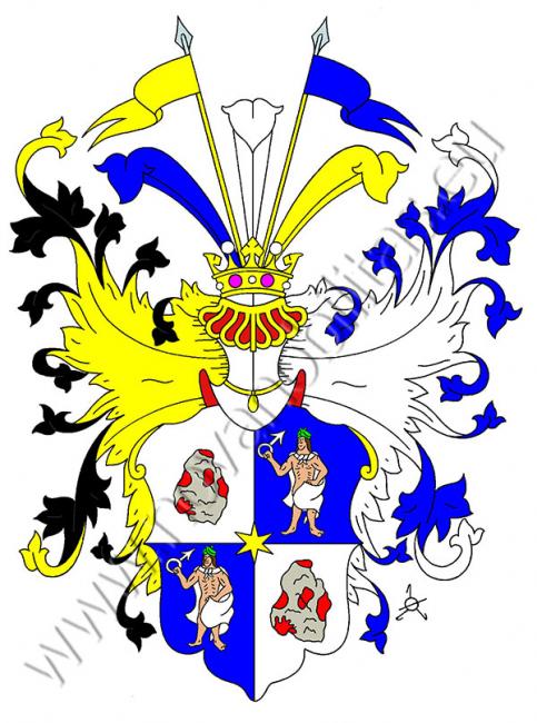 Ve středu stříbrno-modře čtvrceného štítu se vidí zlatá hvězda. V prvním a čtvrtém poli je krví postříkaný kámen, ve druhém a třetím stojí nahý, zeleným věncem korunovaný muž v bílém plášti, který drží v pravici znamení planety Mars. Na štítě stojí korunovaná turnajská přílba s černo-zlatými a modro-stříbrnými přikrývadly. Klenotem jsou tři paví pera - modré, stříbrné a zlaté. Prostřední je provázeno praporky na zlatých ratištích - vpravo zlatým, vlevo modrým.