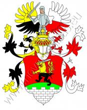 V patě červeného štítu stříbrná hradební zeď, za kterou vyniká zelený vrch. Na něm stojí zlato-černě dělený dvojocasý lev s mečem v pravé tlapě. Na štítě stojí korunovaná turnajská přílba s černo-zlatými a červeno-stříbrnými přikrývadly. Klenotem je rostoucí oděnec s mečem v pravé ruce a s levou rukou na opasku mezi zlato-černě a stříbrno-červeně dělenými křídly.