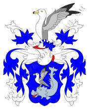 V modrém štítě je přirozený delfín s červeným jazykem a zvednutým ocasem, na kterém stojí racek (tehdejšími slovy mořská vlaštovka) přirozených barev se zvednutými křídly. Na štítě spočívá kolčí přílba s modro – stříbrnými přikrývadly a s točenicí týchž tinktur. Klenotem je rostoucí racek ze štítu.