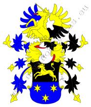 Dělený štít. Nahoře v černém je zlatý jednorožec. Dole v modrém jsou tři zlaté hvězdy (2,1). Na štítě spočívá korunovaná turnajská přílba s modro – zlatými a černo – zlatými přikrývadly. Klenotem jsou dvě rozevřená křídla, pravé dělené modro – zlatě, levé zlato - černě, mezi nimi rostoucí jednorožec ze štítu.