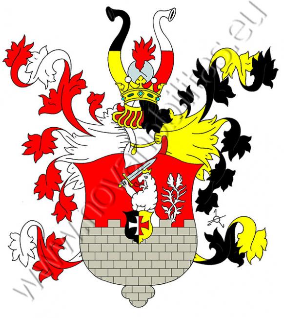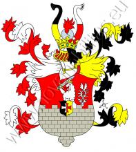 V červeném štítě vyrůstá za hradební zdí stříbrný korunovaný dvojocasý lev držící v pravé tlapě meč se zlatým jilcem a záštitou, v levé černo-zlatě polcený štít se stříbrno-červeně polceným křížem. Na štítě stojí korunovaná turnajská přílba s červeno-stříbrnými a černo-zlatými přikrývadly. Klenotem jsou dva dělené rohy, pravý černo-zlatě, levý stříbrno-červeně, mezi kterými se vidí hořící granát.