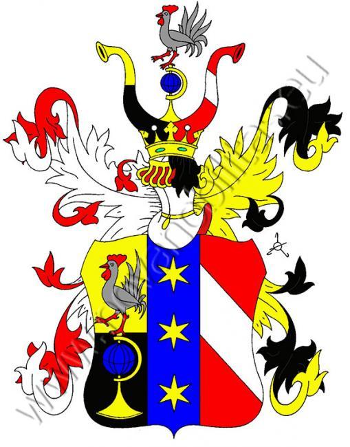 Dvakrát polcený štít. Pravé pole je zlato-černě dělené. Nahoře kohout popelavé barvy stojící na modrém globu se zlatým stojanem ve spodním poli. V prostředním modrém poli se vidí tři zlaté hvězdy nad sebou. Levé pole je červené se stříbrným kosmým břevnem. Na štítě stojí korunovaná turnajská přílba s červeno-stříbrnými a černo-zlatými přikrývadly. Klenotem jsou dva rohy, pravý zlato-černě dělený, levý červený se stříbrným kosmým břevnem, a mezi nimi kohout popelavé barvy stojící na zemské sféře z pravého pole štítu.