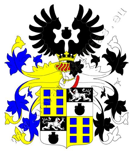 Čtvrcený štít. V prvním a čtvrtém zlatém poli šest modrých čtverců ve dvou sloupcích (3, 3). Druhé a třetí pole je černo-stříbně děleno. Nahoře stříbrný kráčející lev s červeným jazykem, dole černá bomba se dvěma uchy na horních stranách. Na štítě spočívá korunovaná turnajská přílba s modro–zlatými a černo–stříbrnými přikrývadly. Klenotem jsou dvě rozevřená černá křídla, mezi nimi bomba ze štítu.