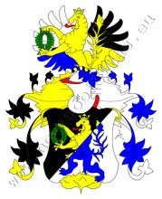 V černo – stříbrně šikmo děleném štítě je na zlaté skále zlato - modře šikmo dělený korunovaný lev s červeným jazykem držící v předních tlapách zelený vavřínový věnec. Na štítě spočívá kolčí přílba s černo – zlatými a modro – stříbrnými přikrývadly a s točenicí týchž tinktur. Klenotem jsou dvě rozevřená křídla, pravé dělené stříbrno – modře, levé černo – zlatě, mezi nimi rostoucí lev ze štítu.