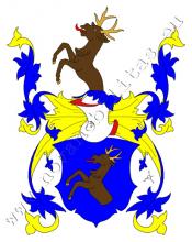 V modrém štítě je polovina srnce přirozených barev. Na štítě spočívá kolčí přílba s modro – zlatými přikrývadly. Klenotem je rostoucí srnec ze štítu.