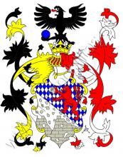Kosmo dělený štít. Nahoře je ve stříbrno - modře routovaném poli červený dvojocasý lev s kamenem v pravé přední tlapě. V stříbrném dolním poli se vidí rozstřílená hradební zeď s odletujícími kameny. Na štítě stojí korunovaná turnajská přílba s černo-zlatými a červeno-stříbrnými přikrývadly. Klenotem je černá orlice s modrou koulí v levém spáru.