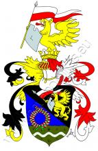 Černo-modře kosmo dělený štít. Nahoře zlatý gryf držící v pravé tlapě zlaté kopí se stříbrno-červeně děleným praporkem, v levé železné tarče routového tvaru. Dole se na bažině, kterou protéká řeka, vidí [zelený] vavřínový věnec střídavě s červenými a stříbrnými listy. Na štítě stojí korunovaná turnajská přílba s černo-zlatými a červeno-stříbrnými přikrývadly. Klenotem je rostoucí gryf ze štítu.
