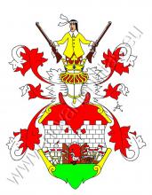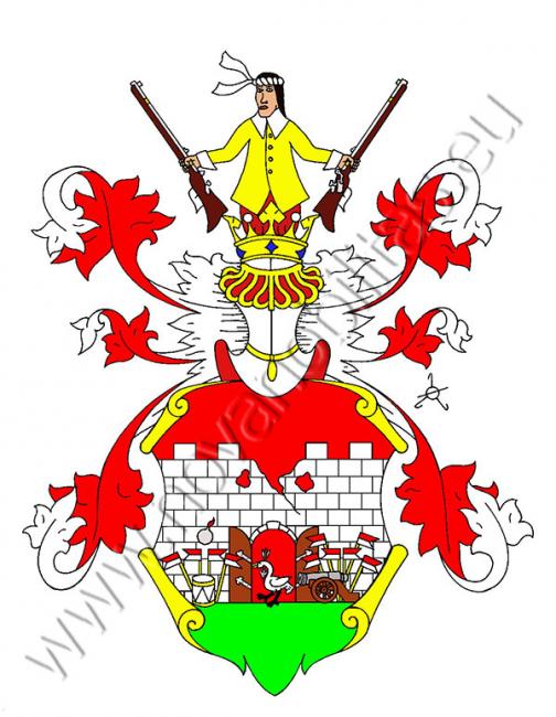 V červeném štítě je na zelené půdě dělostřelbou poškozená stříbrná hradba s otevřenou branou s železnými panty, v níž stojí stříbrná labuť s černýma nohama a s krkem shora dolů prostřeleným šípem. Napravo do brány se vidí stříbrný vojenský buben provázený čtyřmi stříbno-červenými praporci a převýšený hořícím granátem, nalevo je dělo s šesti stříbrno-červenými praporci. Na štítě stojí korunovaná turnajská přílba s červeno-stříbrnými přikrývadly. Klenotem je muž ve zlatém kolaru s bílým límcem a s točenicí na hlavě, který v každé ruce drží mušketu.