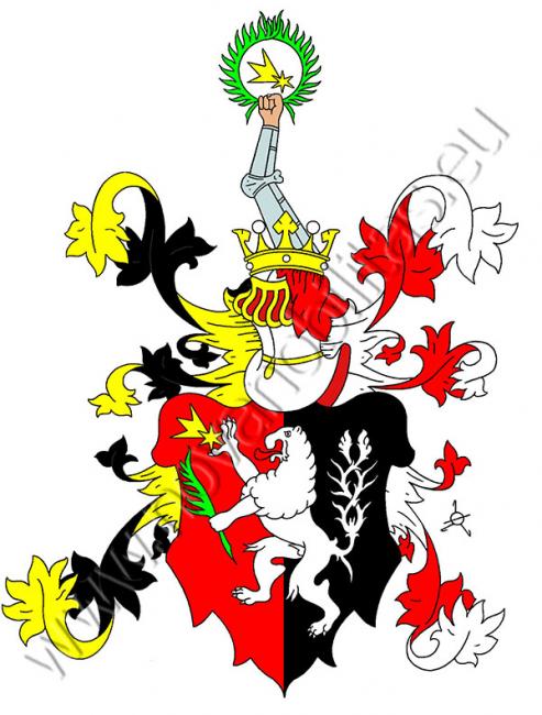 V červeno-černě polceném štítě stříbrný dvojocasý lev držící v pravé tlapě zlatou hvězdu, ze které vynikají kosmo vzhůru tři [zlaté] paprsky, v levé pak zelenou palmovou ratolest. Na štítě stojí korunovaná turnajská přílba s černo-zlatými a červeno-stříbrnými přikrývadly. Klenotem je obrněná pravá ruka držící zelený palmový věnec, uprostřed kterého se vidí hvězda s paprsky ze štítu.