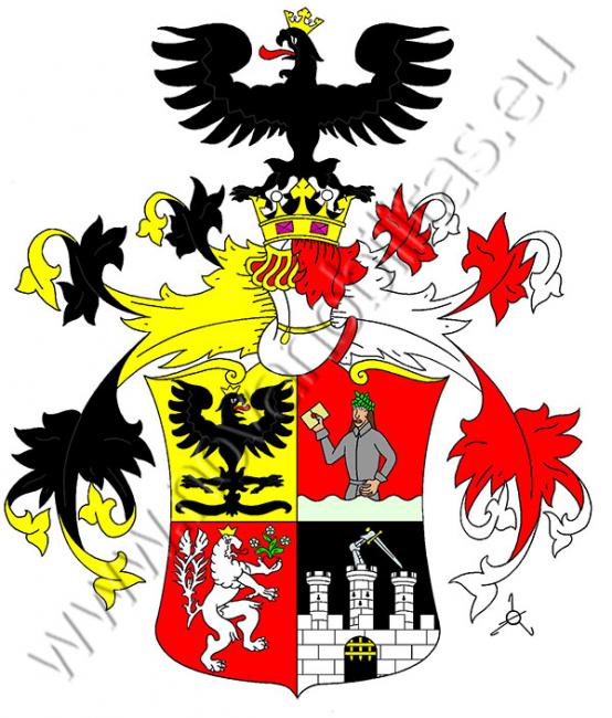Čtvrcený štít. První pole je zlaté s černou, korunovanou, do středu hledící orlicí. Druhé a třetí pole štítu je červené. Ve druhém vyniká z vody v patě pole šedě oděný a vavřínovým věncem korunovaný mladík s dopisem v pravici a s levou rukou opřenou v bok, ve třetím poli se pak vidí do středu štítu obrácený, stříbrný, dvojocasý, korunovaný lev držící v levé tlapě červené srdce, ze kterého vyrůstají tři stříbrné růže na zelených stoncích. Ve čtvrtém černém poli je stříbrná hradební zeď prolomená otevřenou bránou s vytaženou padací mříží. Za hradbou se pak vidí tři stříbrné kulaté věže se střílnami zakončené cimbuřím. Z prostřední, se třemi střílnami, vyniká obrněná ruka držící meč se zlatým jilcem a záštitou. Na štítě stojí korunovaná turnajská přílba s černo-zlatými a červeno-stříbrnými přikrývadly. Klenotem je doprava hledící orlice z prvního pole štítu.