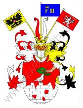 V červeném štítě stříbrná, dělostřelbou poškozená hradební zeď s cimbuřím. Na prostřední stínce sedí doleva otočená stříbrná holubice se zelenou olivovou ratolestí v zobáku, nad kterou se vidí zelený vavřínový věnec držený rukou vynikající z oblaků v levém horním rohu štítu. Na štítě stojí korunovaná turnajská přílba s červeno-stříbnými a černo-zlatými přikrývadly. Klenotem jsou tři praporce (prostřední modrý se zlatou korunovanou iniciálou F III, pravý zlatý s černým dvojhlavým orlem s červeným štítkem se stříbrným břevnem na prsou, levý pak červený s českým lvem), mezi kterými se vidí dva rohy - pravý červený a levý stříbrný.