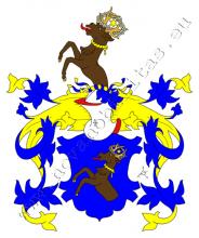V modrém štítě je polovina srnce přirozených barev, který má kolem krku zlatý úvaz a na parohy navlečený věnec ze stříbrných růží se zlatými semeníky uprostřed se zlatou hvězdou. Na štítě spočívá kolčí přílba s modro – zlatými přikrývadly a s točenicí s feflíky týchž tinktur. Klenotem je rostoucí srnec ze štítu.